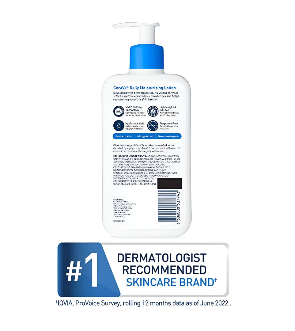 Perfect for everyday use, CeraVe Daily Moisturizing Lotion keeps your skin balanced and nourished throughout the day. Its dermatologist-developed, fragrance-free, and non-comedogenic formula ensures safe, effective care for all skin types, providing continuous hydration, improving skin texture, and supporting overall skin health. Incorporate this lotion into your morning and evening skincare routine to maintain a smooth, resilient, and radiant complexion.