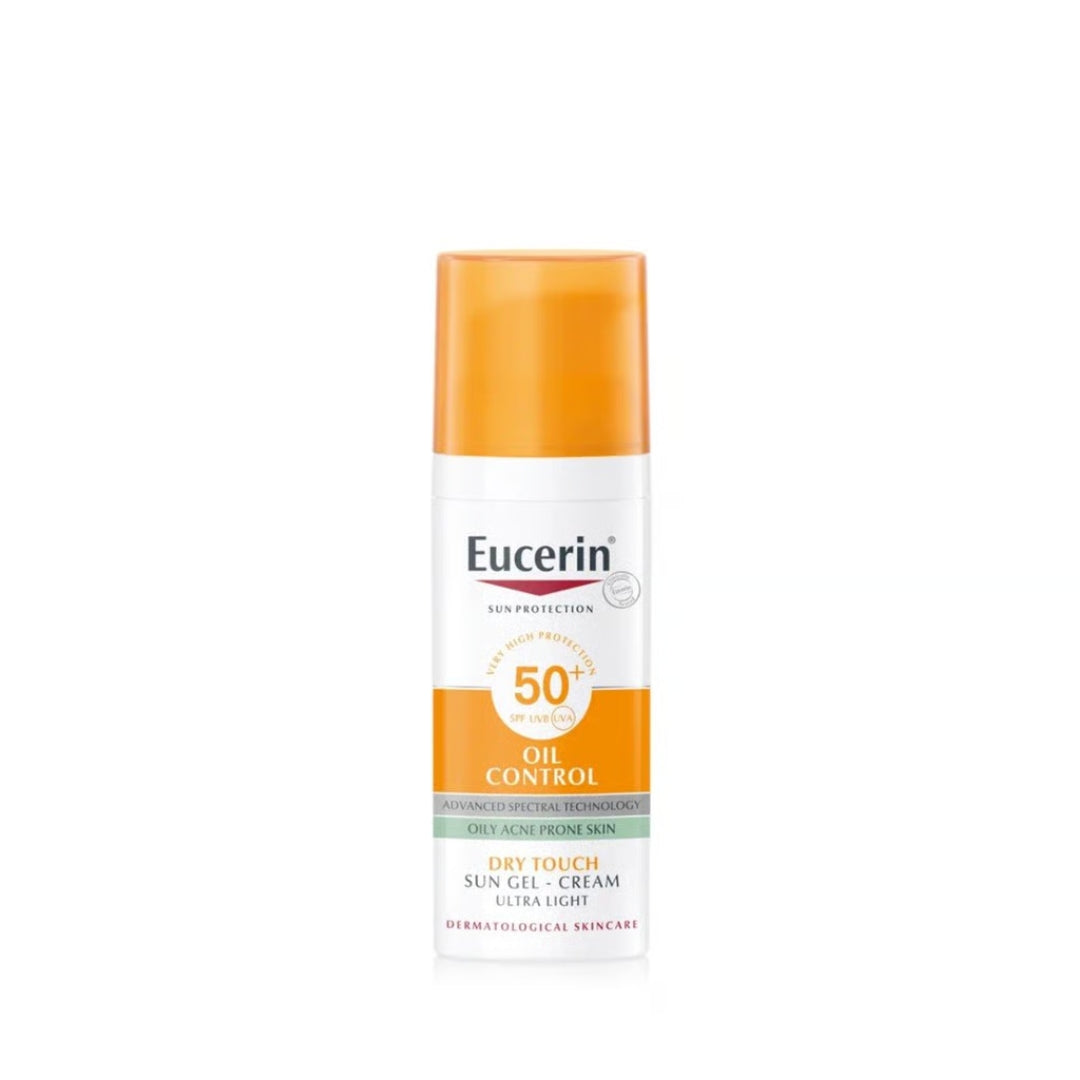 Eucerin Oil Control Sun Gel-Cream Dry Touch SPF50+ Sunscreen 50ml is a daily sunscreen specially indicated for the needs of oily and acne-prone skin. It not only protects from the sun but also helps control sebum and reduces excess shine. With Licochalcone A, glycyrrhetinic acid, and sunscreen filters, it not only provides very high sun protection against both UVA and UVB rays but also shields the skin from visible light and oxidative stress. And, with L-Carnitine and lipid-absorbing microparticles, it helps control sebum and reduce excess shine, mattifying the complexion for up to 8 hours. Moreover, with a lightweight and quickly absorbed gel-cream texture, this sunscreen provides a dry-touch finish and is an excellent makeup base. Last but not least, it is resistant to water and sweat.